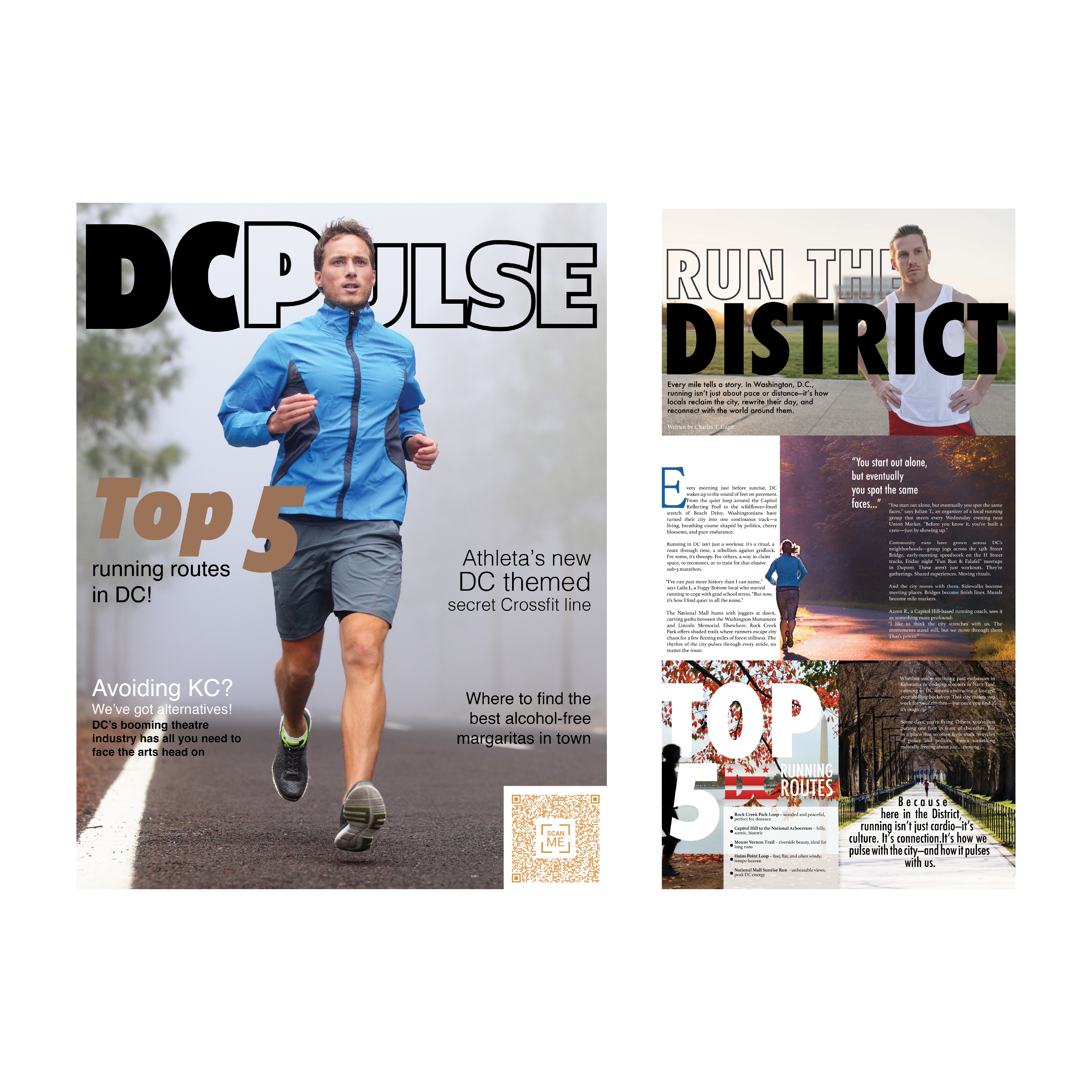 An editorial concept exploring running culture as a defining rhythm of Washington, D.C. — turning ordinary routes into shared ritual through bold typographic hierarchy and energetic grid work.