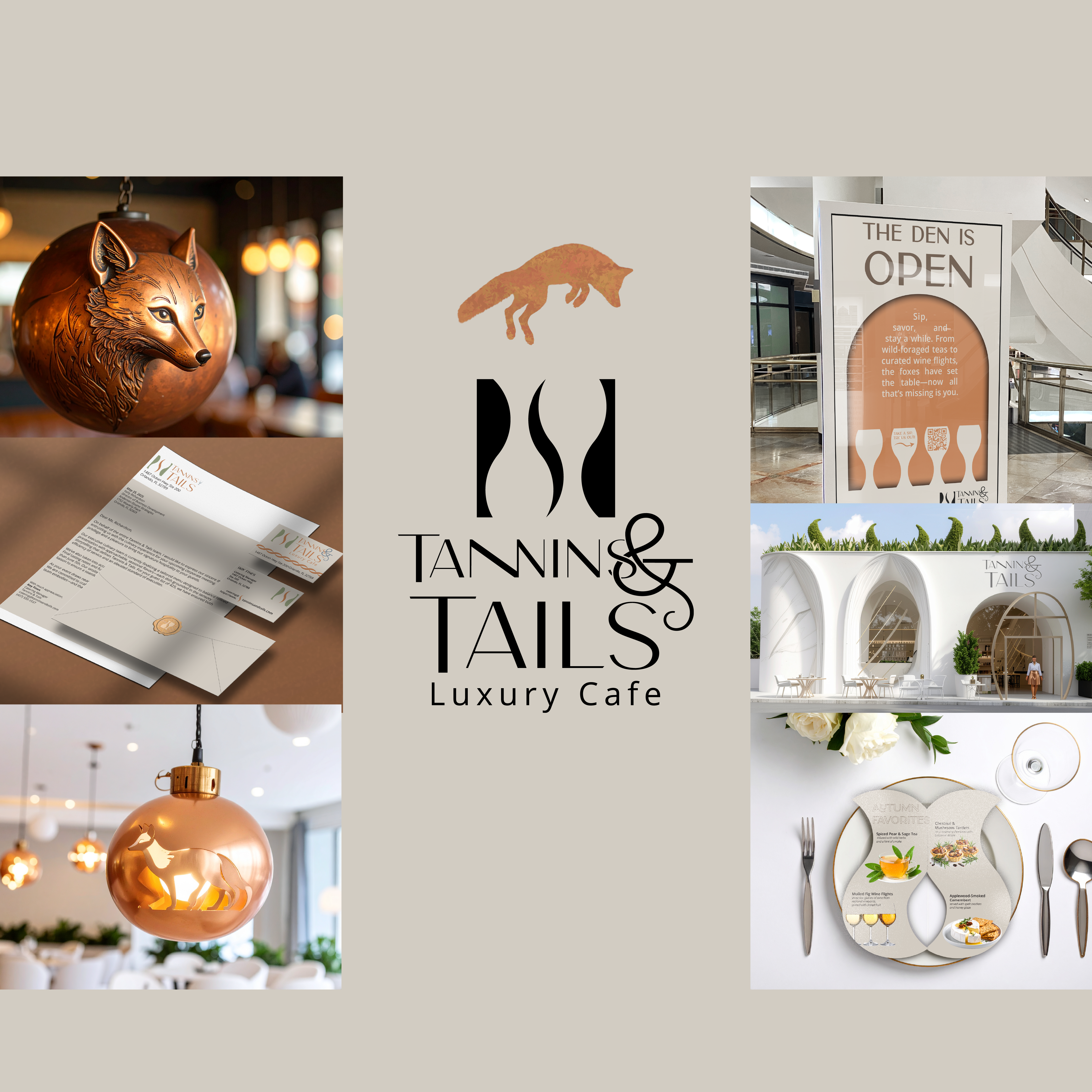 An upscale fox-run café concept — luxury without stiffness, sophistication with a wink.